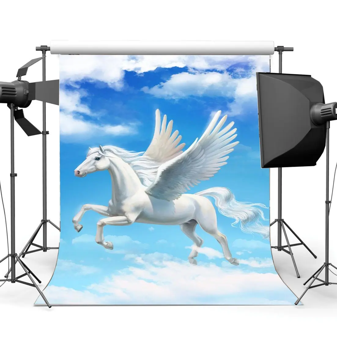 TOP Photography Backdrop Dreamy World Fairy Tale Flying White Horse Blue Sky White Cloud Fantasy Landsc