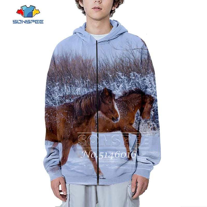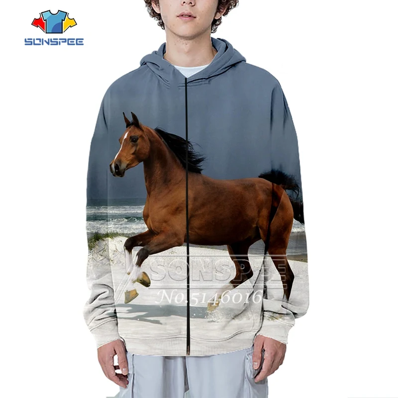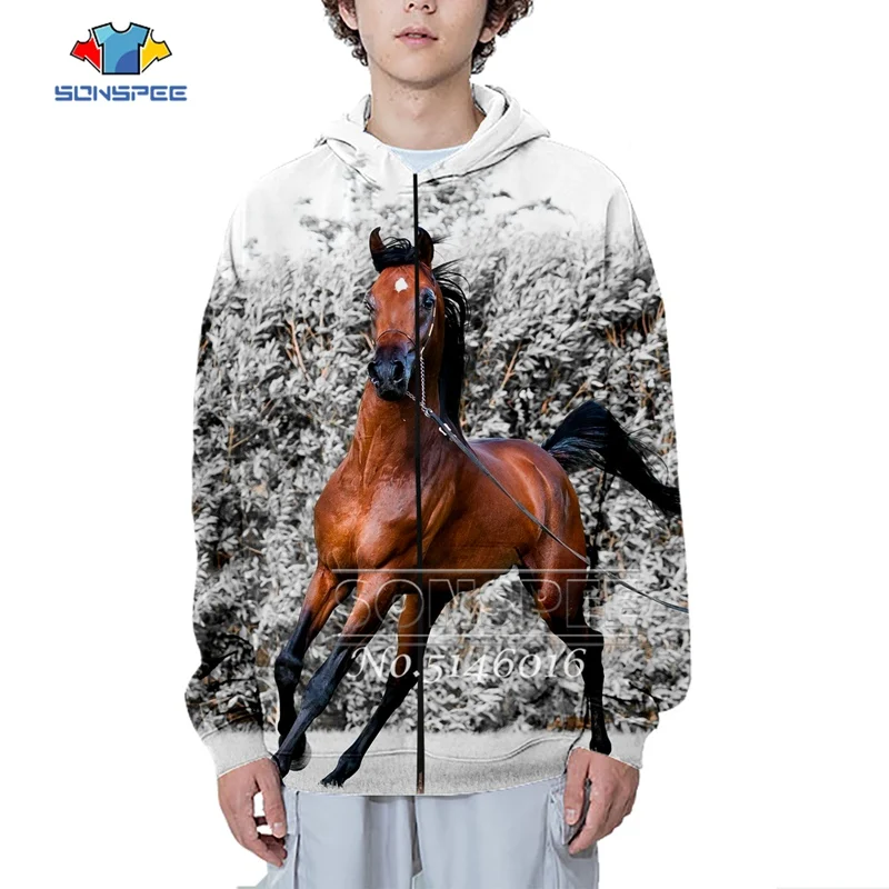 Unisex Fashion Casual Men Street wear Funny Sweatshirt zip Hoody Animal horse 3D Print Harajuku zip