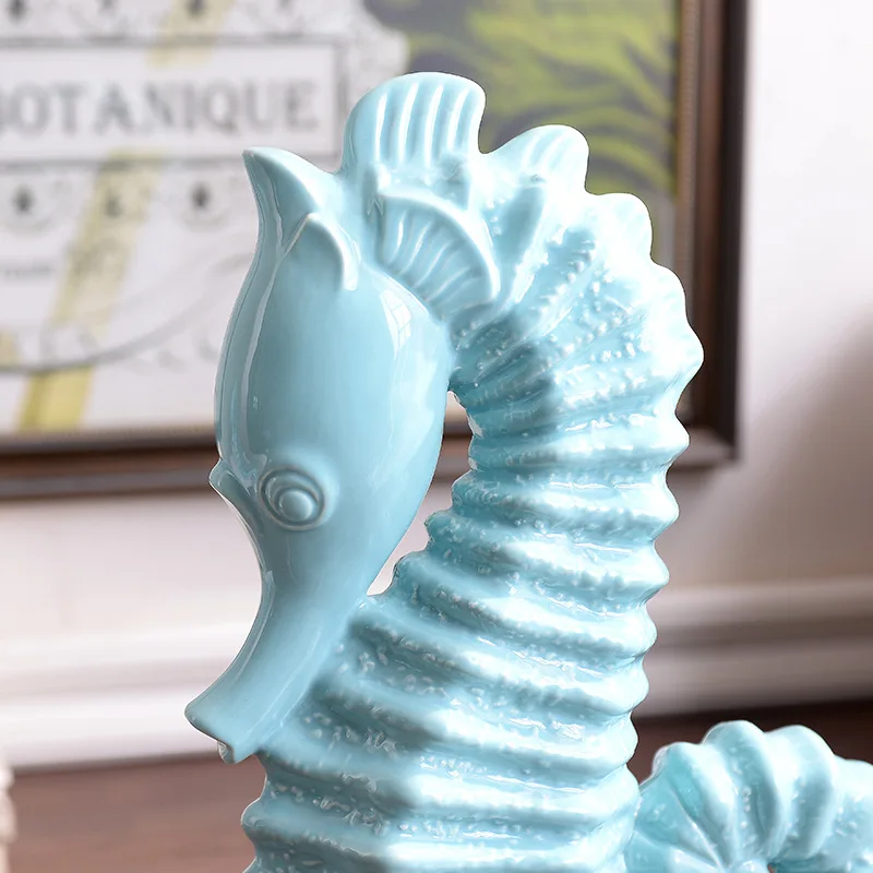 Hot Sale Mediterranean Big Blue Hippocampus Ceramic Figurine Decorations For Home Handmade Sea Horse Tableto