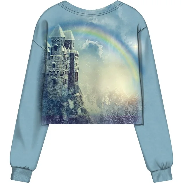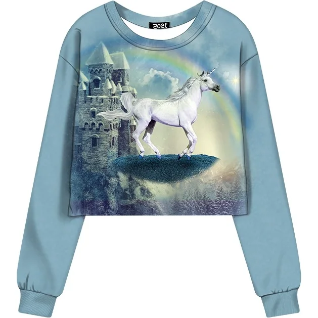HOT SALE Women Long Sleeve Crop Top 2018 Unicorn White Horse Castle Rainbow Star Printed Short Sweatshirt fo